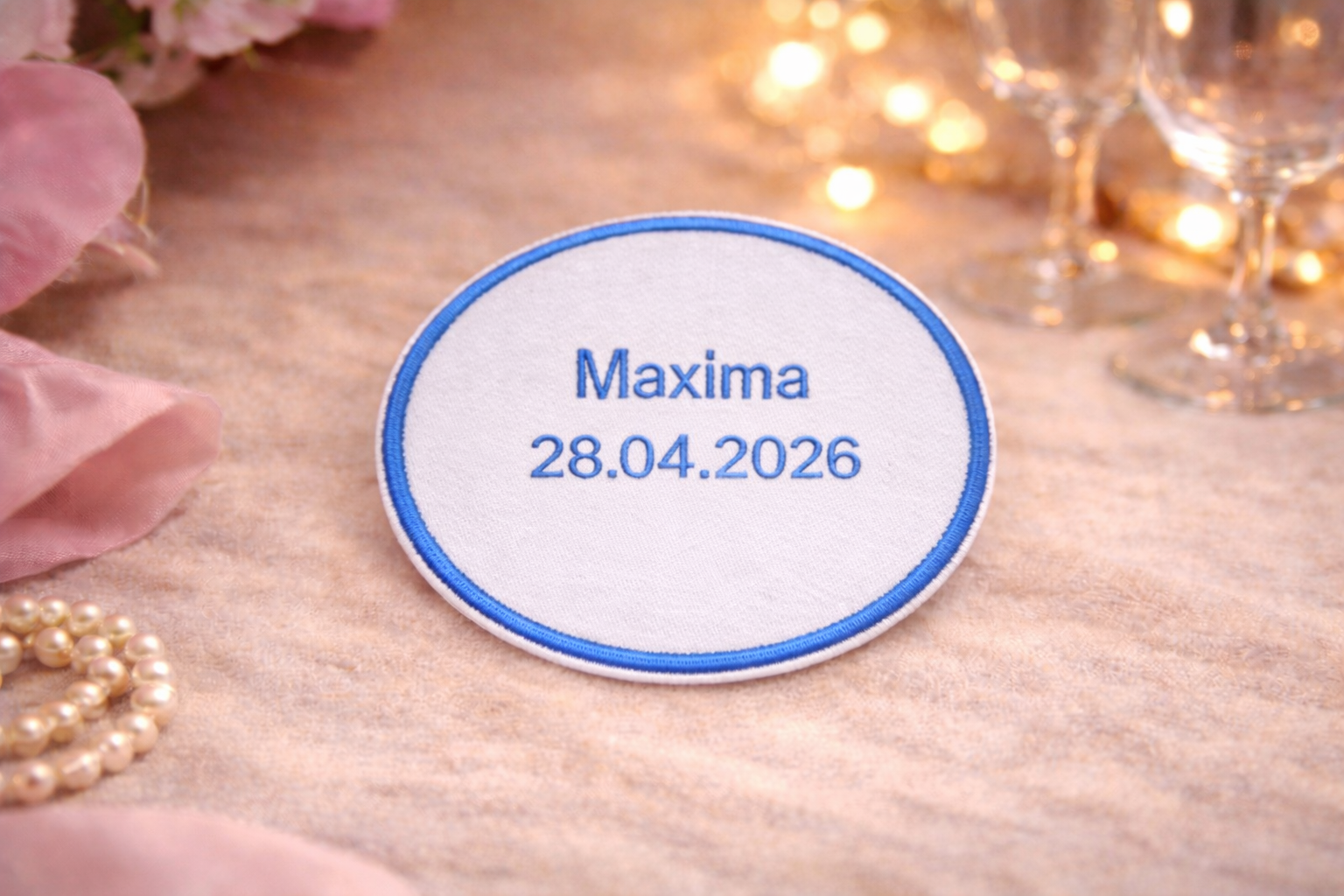 Dein Wunschname, Datum oder kurzer Spruch wird hochwertig auf das Emblem gestickt. Bitte beachte: