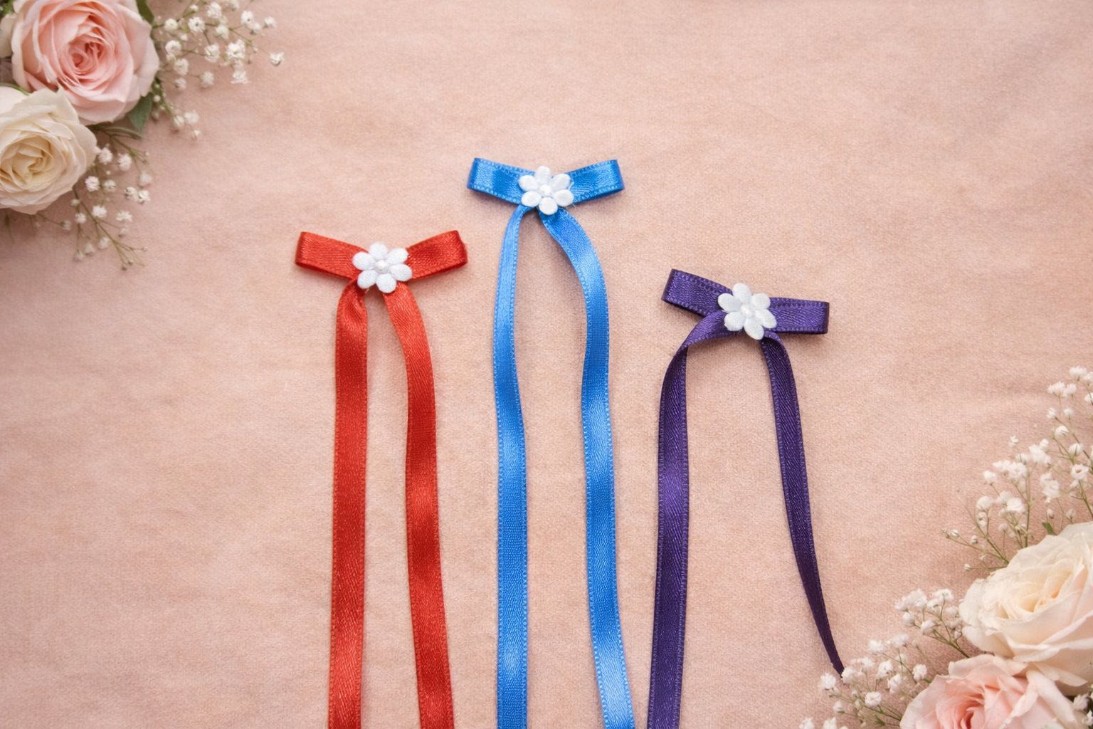 Im Mittelpunkt der Schleife befindet sich eine edle weiße Satinblume, die für einen besonders liebevollen und eleganten Look sorgt.
