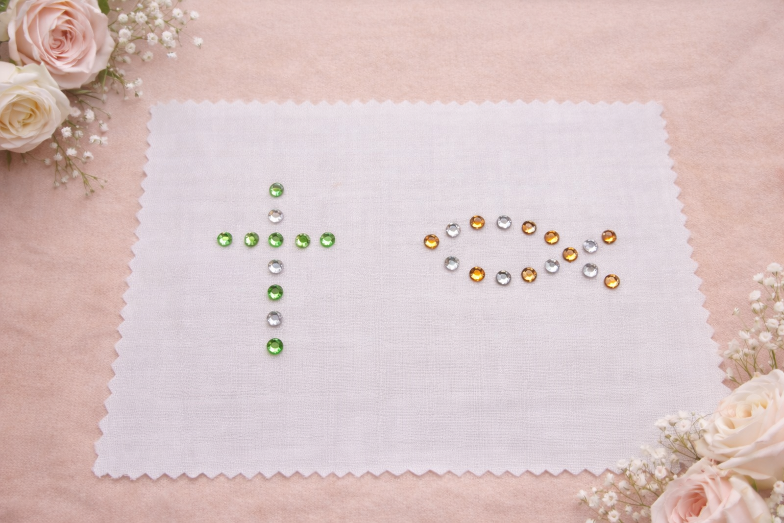 Zusatzmotiv für Taufkleidung – Kreuz oder Fisch aus gemischten funkelnden Glassteinen