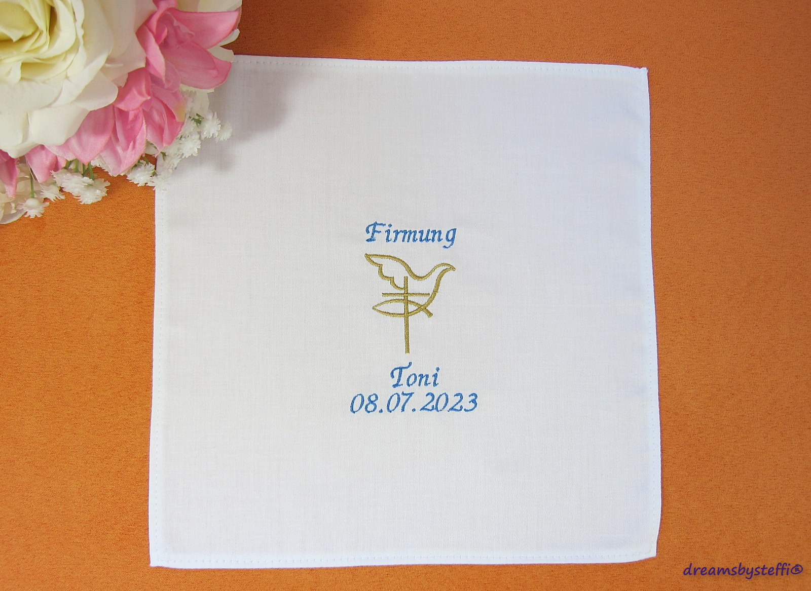 Das Tuch wird mit dem Namen und Datum des Anlasses sowie dem gewählten Motiv bestickt.