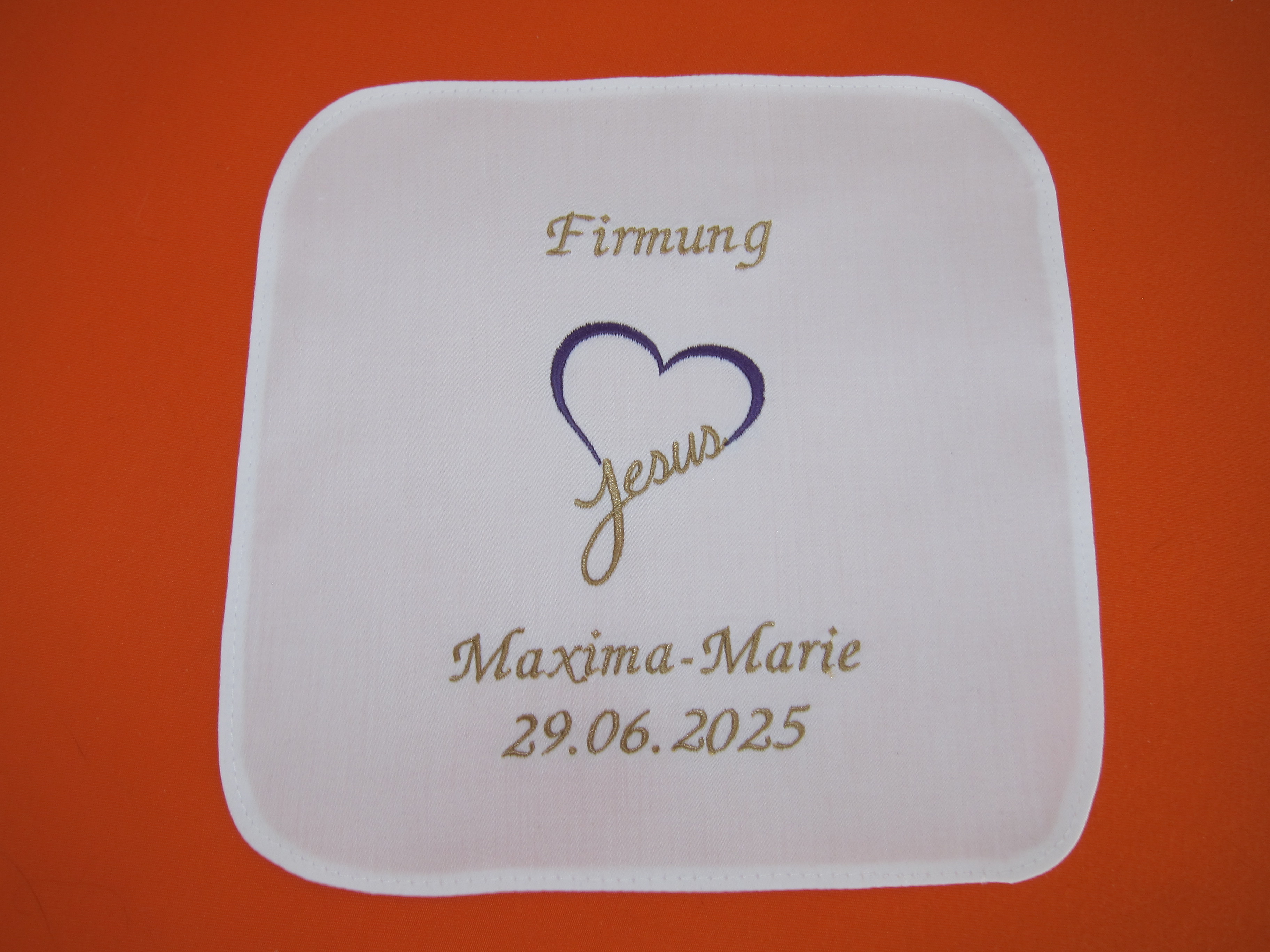 Das Tuch wird mit dem Namen und Datum des Anlasses sowie dem Motiv Herz mit Jesus Schriftzug bestickt.