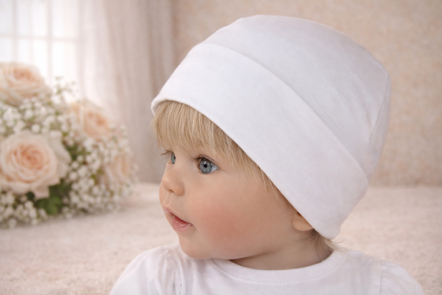 Weiße Taufmütze aus Weichem, dehnbarem Stoff mit Umschlag.