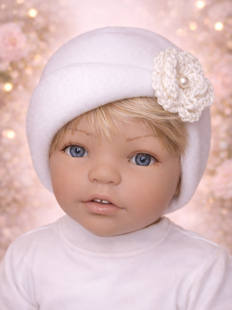 Diese liebevoll handgefertigte Taufmütze ist das perfekte Accessoire für die Taufe deines Babys. Sie besteht aus hochwertigem, weichem Polar Fleecestoff und hält dein Kind angenehm warm und geborgen – auch bei kühleren Temperaturen. Die weiße Mütze ist zweifarbig gestaltet: Sie wird durch eine wunderschöne wollweiße Häkelblume mit einer edlen Perle stilvoll verziert.