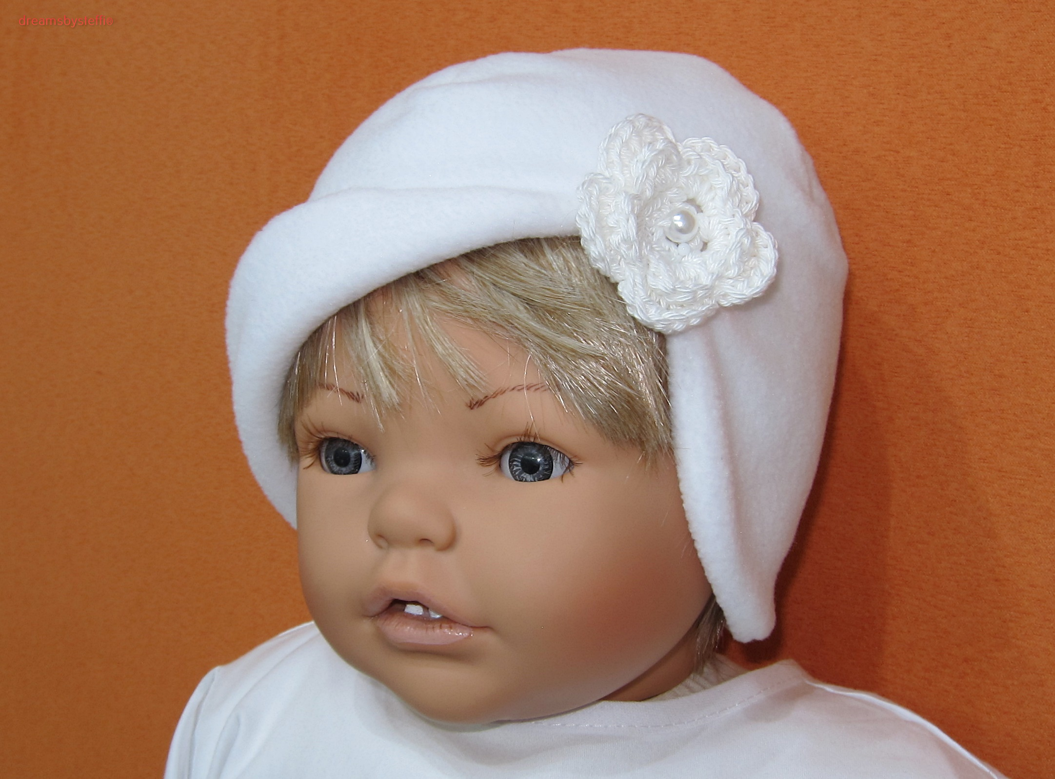 Wintertaufe zweifarbige Taufmütze Polar Fleece mit Häkelblume und Perle
