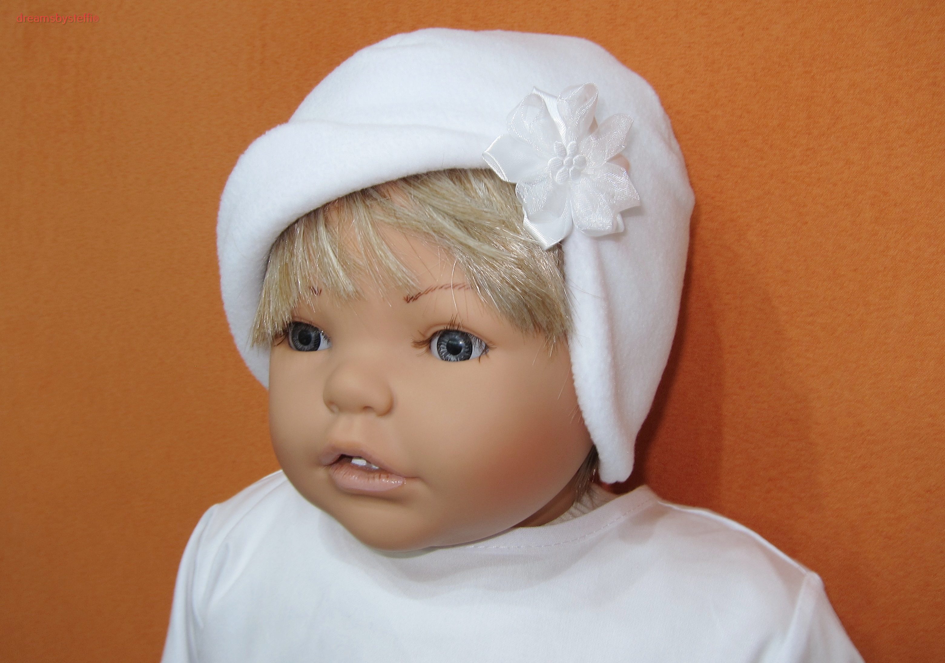 Startseite » Winter Taufe » Taufmütze Fleece » Wintertaufe Taufmütze aus Fleece + Satin - Organza Blume